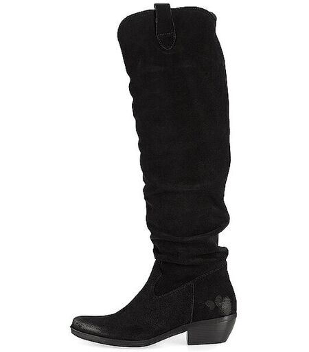 Damen Boots im Cowboy-Style Hochwertiges Velourleder Breiter Schaft mit zwei Laschen seitlich Zulaufende Spitze Kompakter Blockabsatz Absatzhöhe: ca. 3cm Farbbezeichnung: Black Material: Velourleder ...