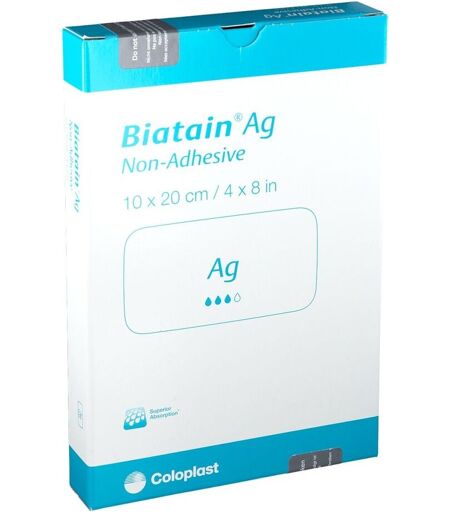 BIATAIN® Ag Schaumverband mit Silber nicht-haftend Biatain® Ag nicht-haftend kann bei einem breiten Spektrum exsudierender Wunden mit verzögerter Heilung aufgrund von Bakterien oder Wunden mit Infektionsrisiko eingesetzt werden, insbesondere bei Ulcus cruris, Dekubitus, diabetischem Fußsyndrom, Verbrennungen zweiten Grades, Spalthautentnahmestellen, postoperativen Wunden und Hautabschürfungen. Biatain® Ag nicht-haftend kann auch unter Kompressionstherapie eingesetzt werden.Zusammensetzung Biatain® Ag nicht-haftend ist ein weicher, flexibler, saugfähiger Polyurethan-Schaumverband mit einem patentierten Silberkomplex, der homogen im ganzen Schaumverband verteilt ist.Beschreibung: Bei Kontakt mit Wundexsudat wölbt sich die einzigartige 3D-Schaumstruktur von Biatain® Ag nicht-haftend zum Wundgrund und sorgt so für exzellente Absorption – auch unter Kompression Das anhaltende Silberfreisetzungsprofil gewährleistet eine homogene Verteilung von Silberionen und bietet eine anhaltende antibakterielle Wirkung während der gesamten Tragezeit (bis zu 7 Tage) Durch das anhaltende Silber-Freisetzungsprofil ist eine anhaltende antibakterielle Wirkung während der gesamten Tragezeit (bis zu 7 Tage) gegeben Bei Anwesenheit von Wundexsudat wird bis zu 7 Tage lang kontinuierlich Silber in den Wundgrund abgegeben Produktdetails: Größe: 10x20cm ...