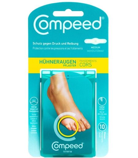 brAnwendungsgebiet von Compeed Hühneraugen PflasterCompeed Hühneraugen Pflaster entfernt Hühneraugen am Fußballen oder an den Zehen und lindert den Druckschmerz. Bei schmerzhaften Hühneraugen am Fuß ist rasches Handeln gefragt. Schnelle Hilfe gegen Hühenraugen bieten die Compeed Hühneraugen Pflaster. Sie lindern den Druckschmerz sofort nach dem Auftragen und schützen das Hühnerauge vor weiterer Reibung und Druck. Anders als herkömmliche Pflaster setzt das Compeed Hühneraugen Pflaster auf das Prinzip der feuchten Wundheilung mit Hydrokolloid-Technologie. Es hält das Hühnerauge feucht, weicht es schonend auf und unterstützt so wirksam die Entfernung. Das Compeed Hühneraugen Pflaster weist Wasser, Schmutz und Bakterien ab und haftet im direkten Vergleich zu herkömmlichen Pflastern tagelang sicher. Es eignet sich besonders für Hühneraugen am Fußballen oder an den Zehen. DosierungAnwendungsempfehlung: Die Haut vor der Anwendung säubern und trocknen. Um einen optimale Haftung zu gewährleisten, muss die Hautstelle rund um das Hühnerauge frei von Creme- und Fettrückständen sein. Zuerst das obere, dann das untere Schutzpapier entfernen, ohne die Klebefläche zu berühren. Das Pflaster mit dem integrierten Wirkstoffplättchen direkt auf das Hühnerauge kleben und die Ränder sorgfältig glatt streichen. Das Pflaster erst entfernen, wenn es beginnt sich von selbst zu lösen. Nach max. 48 Stunden das Pflaster entfernen. Hühnerauge 5 Minuten im warmen Wasser aufweichen, dann die lose Haut entfernen. Wenn erforderlich, kann diese Anwendung bis zu 2 Wochen lang wiederholt werden. Compeed Hühneraugen Pflaster können in Ihrer Versandapotheke www.juvalis.de erworben werden. ...