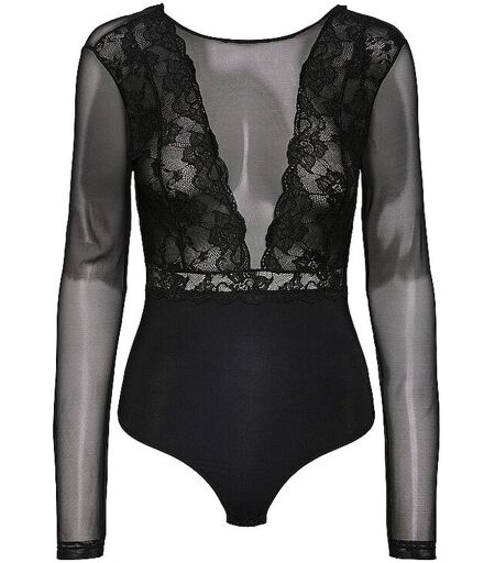 Modischer Damen Body mit Spitzen-Details Tiefer V-Ausschnitt Langarm Mesh Details Atmungsaktives Mesh-Futter String mit Druckknopfverschluss Unifarben Schmale Passform Farbbezeichnung: Black Material: 85% Polyamid, 15% Elasthan ...