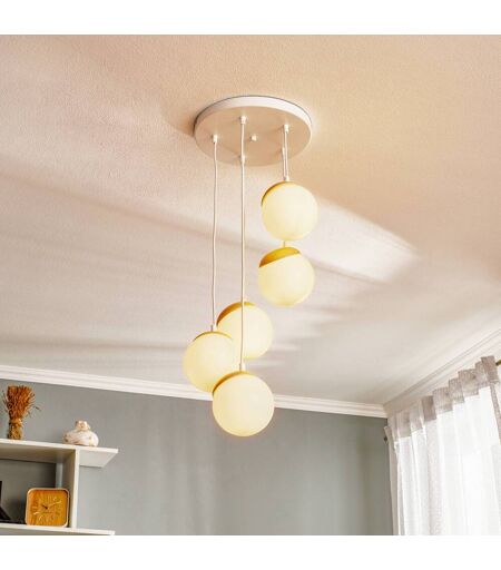 Die weiße Pendelleuchte Sfera verfügt über fünf Kugelschirme aus Opalglas mit Kappen aus hellem Holz. Die Schirme hängen als Rondell vom runden, weißen Baldachin aus Metall herab. ...