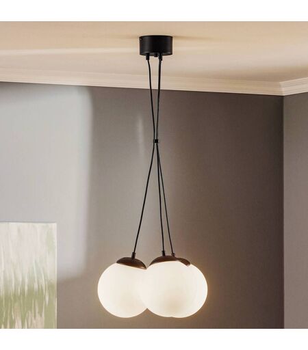 Die Pendelleuchte Lima ist mit drei an den Kabeln gebündelten Kugelschirmen aus Opalglas ausgestattet. Diese sind jeweils mit einer Metallkappe besetzt, welche ebenso wie die Kabel und der runde Baldachin in Schwarz gehalten sind. ...