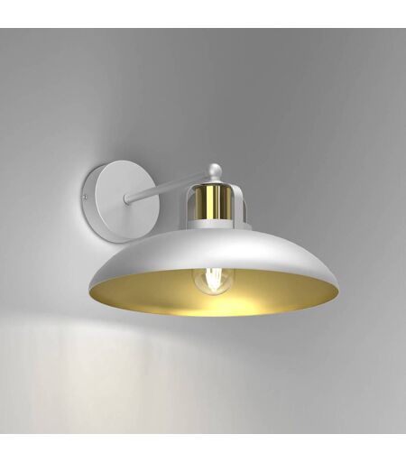 Der weiße Schirm der im industriellen Look kreierten Wandleuchte Felix ist auf der Innenseite zugunsten einer optimalen Lichtreflexion goldfarben lackiert. Das verleiht dem abstrahlenden Licht einen warmen, gemütlichen Touch. - mit goldfarbenem Fassungsdetail ...