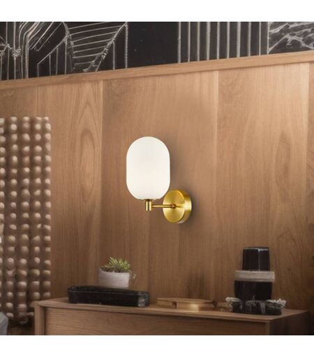 Die elegante Wandleuchte Alias setzt sich aus einer runden Wandbefestigung sowie einem Kurzen Ausleger aus Metall in folgendem Finish sowie einem nach oben gerichteten, hochovalen Lampenschirm aus Opalglas zusammen. ...