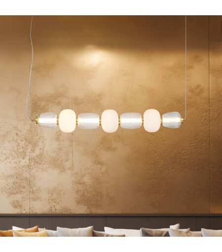 Die LED-Pendelleuchte Caro zeichnet sich durch den horizontalen, opalen Lichtleiter aus, in dessen Innern die LEDs integriert sind. Dieser verläuft durch sieben aufgereihte Glaselemente. Davon sind vier transparent und drei opal. Hinzu kommen Abschlüsse und ein Baldachin aus Metall im Goldfinish. ...