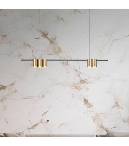 Die Hängeleuchte Genesis verfügt über einen schwarzen, horizontal verlaufenden Balken, der insgesamt fünf nach unten gerichtete GU10-Fassungen beherbergt. Diese liegen innerhalb zylindrischer Aluminiumschirme in goldenem Finish. ...