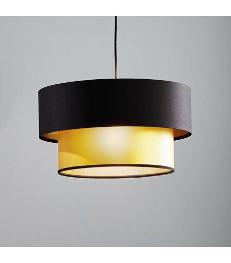 Das glamouröse Design der Hängeleuchte Dorina wird durch den stilvoll gestalteten Doppelschirm erzielt, der aus PVC-Kunststoff gefertigt und mit schwarzem Satinstoff bezogen ist. Der Innenschirm ist golden beschichtet, wobei die Außenseite matt und die Innenseite glänzend ist. So entsteht ein besonderer Glow-Effekt und eine warme Lichtatmosphäre im Raum. ...