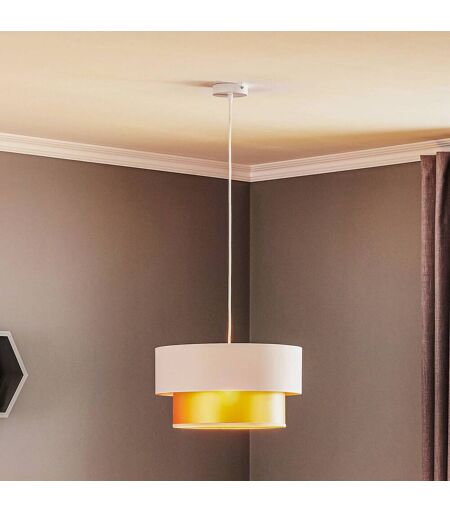 Das glamouröse Design der Hängeleuchte Dorina wird durch den stilvoll gestalteten Doppelschirm erzielt, der aus PVC-Kunststoff gefertigt und mit cremefarbenem Satinstoff bezogen ist. Der Innenschirm ist golden beschichtet, wobei die Außenseite matt und die Innenseite glänzend ist. So entsteht ein besonderer Glow-Effekt und eine warme Lichtatmosphäre im Raum. ...