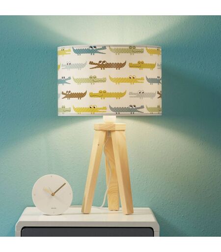 Die dreibeinige Tischleuchte Kroko besitzt einen Lampenschirm, der mit einem kindgerechten Fotodruck außen versehen ist. Das Gestell ist aus echtem Holz und liegt genau im Trend. Ideal für die indirekte Beleuchtung im Kinderzimmer. ...