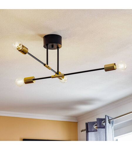 Bei der schwarzen, vierflammigen Deckenleuchte Ilia hält ein runder Baldachin zwei kurze senkrechte Ausleger, an denen je ein langer Arm rechtwinklig angebracht ist. Die Enden der gekreuzt verlaufenden Arme halten die vier offenen Fassungen, welche gemeinsam mit den Verbindungselementen der Arme einen goldenen Farbkontrast erzeugen. ...