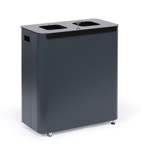 Mülleimer für die Mülltrennung für Innenbereiche aus verzinktem Stahl mit einer Dicke von 1 mm, pulverbeschichtet Grau RAL 7016 Deckel mit Schmetterlingsscharnieren und einer Öffnung zum Einwerfen von Müll Räder für einfache Handhabung, Griffe für einfachen Transport Schloss zum Schutz vor unbefugtem Öffnen rutschfeste, verstellbare Füße zum Ausgleich von Unebenheiten und für mehr Stabilität die Mülleimer sind mit Ständern mit Halterungen für Müllsäcke ausgestattet es können auch Aufkleber zum Markieren der Art des Mülls zugekauft werden, Katalognummer 528001 Eigenschaften: Deckelfarbe: schwarz, Korbfarbe: grau, Material: verzinkter Stahl, Volumen (l): 2 x 60, Breite (mm): 645, Tiefe (mm): 360, Höhe (mm): 705 ...