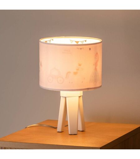 Die Kinder-Tischleuchte Mathilde mit Dreibeingestell aus Holz überzeugt mit einer märchenhaften Szenerie. Die Innenseite des weißen Schirms ist mit Motiven, wie einer Prinzessin und einer Kutsche, dekoriert. Im ausgeschalteten Zustand sind diese von außen nicht zu sehen. Wird das Licht eingeschaltet, scheint die Szenerie sanft durch den Schirm. Mit Schalter (ein/aus) am Kabel. Für ein E27-Leuchtmittel (nicht enthalten). ...
