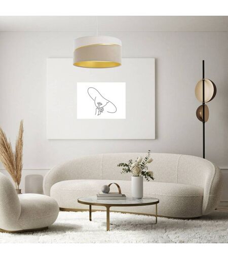 Die Hängeleuchte Susan überzeugt mit ihrer eleganten Erscheinung. Der asymmetrisch gestaltete Schirm aus Velours präsentiert sich äußerlich in Weiß und Beige, wobei die beiden Farben durch eine goldene Linie getrennt werden. Das Innere des Schirms ist vollständig in Gold gehalten, was für eine besonders angenehme Atmosphäre sorgt. Für ein E27-Leuchtmittel (nicht enthalten). ...