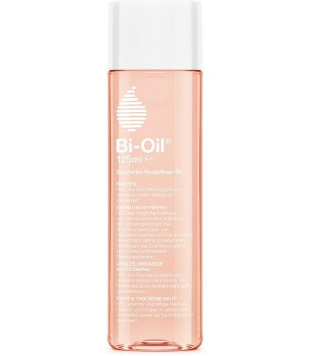 Bi-Oil ist ein spezielles Hautpflegeprodukt, entwickelt, um das Erscheinungsbild von Narben, Dehnungsstreifen und ungleichmäßiger Hauttönung zu verbessern. Die einzigartige Formulierung ist darüber hinaus wirksam bei reifer und trockener Haut. Die Zusammensetzung von Bi-Oil ist eine Kombination aus Pflanzenextrakten und Vitaminen, die in einer Ölbasis gelöst sind. Es enthält den speziellen Bestandteil PurCellin Oil™, der die Konsistenz des Produktes dahingehend ändert, dass es leicht und nicht fettig wirkt und sicherstellt, dass die in den Vitaminen und Pflanzenextrakten enthaltenen Wirkstoffe leicht absorbiert werden. Nicht auf verletzter Haut anwenden. Bei etwaigem Auftreten von Hautreizungen nicht weiter anwenden. Augenkontakt vermeiden. BeiAugenkontakt gründlich mit Wasser ausspülen. Außer Reichweite von Kindern aufbewahren. Inhaltsstoffe Paraffinum Liquidum, Triisononanoin, Cetearyl Ethylhexanoate, Isopropyl Myristate, Retinyl Palmitate, Helianthus Annuus Seed Oil (Vitamin A-Palmitat), Tocopheryl Acetate (Vitamin E-Acetat), Anthemis Nobilis Flower Oil (Öl der römischen Kamille), Lavandula Angustifolia Oil (Lavendelöl), Rosmarinus Officinalis Leaf Oil (Rosmarinöl), Calendula Officinalis Extract (Ringelblumenextrakt), Glycine Soja Oil, BHT, Bisabolol, Alpha-Isomethyl Ionone, Amyl Cinnamal, Benzyl Salicylate, Citronellol, Coumarin, Eugenol, Farnesol, Geraniol, Hydroxycitronellal, Hydroxyisohexyl 3-Cyclohexene Carboxaldehyde, Limonene, Linalool, CI 26100 und/oder CI 60725. ...