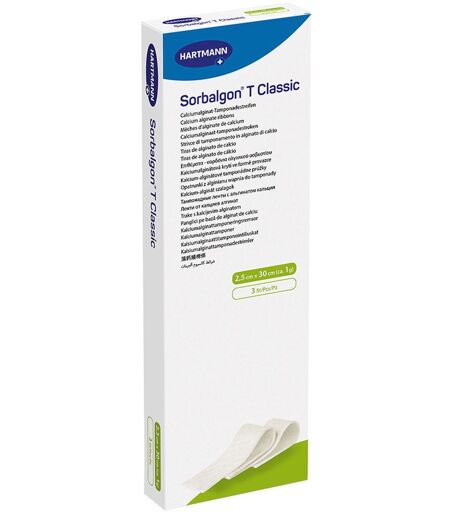 Sorbalgon® T Classic Für tiefe Wunden Das Sorbalgon Classic/Sorbalgon T Classic Alginat wird aus natürlichen, aus Seetang gewonnenen Fasern hergestellt. Es bietet schnelle und starke Saugfähigkeit. Alginat nimmt Wundexsudat auf und bildet eine gelartige Schicht über der Wunde, die ein feuchtes Wundheilungsmilieu schafft, das den Heilungsprozess beschleunigt und zur Blutstillung beiträgt. Die gelartige Oberfläche sorgt außerdem dafür, dass die Kompresse nicht mit der Wunde verklebt und schmerzarm entfernt werden kann. Anwendungsgebiete: Grundsätzlich zur Versorgung aller äußerlichen Wunden; geeignet zur Behandlung von oberflächlichen Wunden, mäßig bis stark exsudierende und tiefe Wunden; Druckgeschwüre; Diabetisches Ulcus crusis; Venöses/arterielles Ulcus crusis; Transplantatentnahmestellen und Operationswunden. Anwendung: Bei tiefen Wunden verwenden Sie bitte Sorbalgon T Classic. Zusammensetzung: Calciumalginat Natriumalginat ...
