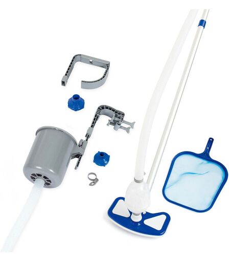 Bestway Flowclear™ Deluxe Pflege-Set Praktisches Komplettset für die Poolpflege Geeignet für Filteranlagen mit einer Leistung von mindestens 2.006 l/h Im Set enthalten: 1 Kescheraufsatz mit robuster Netzbespannung 1 Saugbürstenaufsatz 1 leichter Aluminium-Teleskopstiel für Kescher und Saugbürste (Länge: 279 cm) 1 Schlauch für Saugbürste (Ø 32 mm / Gesamtlänge 750 cm) 1 Oberflächenskimmer für den Anschluss an der Poolinnenseite (2 unterschiedliche Adapter vorhanden) Warnhinweis: Achtung! Bitte Lesen SIE DAS Handbuch Sorgfältig Durch UND Bewahren SIE ES ALS Künftige Referenz Auf. Technische Daten: Gewicht: ca. 4,04 Kg Material: Aluminium, Kunststoff Farbe: silber, blau, weiß Maße (LxBxH): 112 x 27 x 22 cm ...