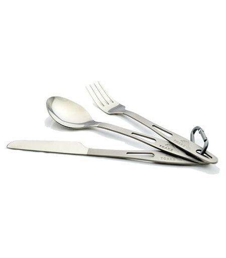 Das Toaks Titan Besteckset besteht aus Löffel, Gabel und Messer und ist aus reinem Titan gefertigt. Alle 3 Teile werden durch einen kleinen Karabiner für den Transport zusammengehalten. Das Besteck ist klein genug, um stets schnell und praktisch verstaut zu sein, dabei aber auch groß genug um bei der Verwendung gut in der Hand zu liegen. Die vorderen Bereiche sind blank poliert, die Griffbereiche sind matt und greifen sich dadurch besser. ...