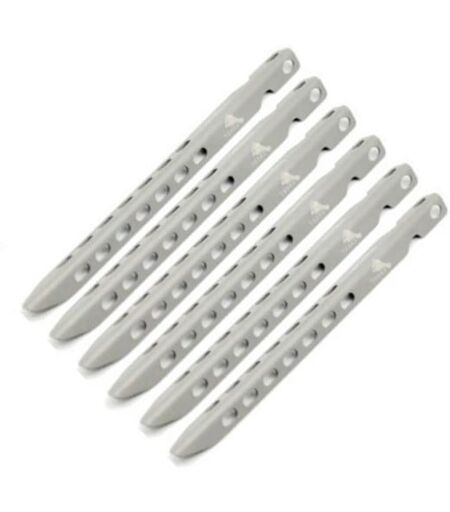 Der Toaks Titanium V-Peg Hering im 6er Pack ist ohnehin schon aus einem der leichtesten und robustesten Materialien gefertigt und trotzdem hat der Hersteller mit den vielen Aussparungen das Fliegengewicht noch weiter reduziert: Gerade einmal 11 g bringt das Titanmodell dadurch auf die Waage. Mit der Einkerbung und den Ösen am oberen Ende wird die Befestigung der Abspannleine und später auch das Herausziehen des Herings erleichtert. Durch das eng zulaufende Ende bekommst du den V-Peg aus Titan außerdem auch in undankbare Böden hinein und das breite Profil bietet auch für weichere Böden genug Auflagefläche. So bekommst du mit dem Toaks Titanium V-Peg Hering eine stabile und wahrhaftig ultraleichte Lösung, die den Packsack deines Zeltes nicht unnötig belastet und dabei für vielfältige Böden geeignet ist. ...