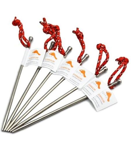 Toaks Titanium Nail Peg Hering ist ein unkaputtbarer Titan Skewer im 6er Pack mit flachem Kopf gegen Abrutschen und Schlaufe aus Nylonschnur zum leichteren Rausziehen. Inkl. 3 g leichtem Nylonpacksack. ...