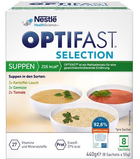 Egal, ob Sie Ihr Gewicht halten oder endlich wieder zu Ihrem Wohlfühl-Body finden möchten: Das umfassende Sortiment der Optifast® Diet Selection kann beides! Es bietet Ihnen bei nur maximal 250 kcal pro Portion eine große Geschmacksvielfalt von lecker-cremig bis herzhaft-würzig. Als vollwertiger Mahlzeitersatz für eine gewichtskontrollierende Ernährung erfüllt die Zusammensetzung hohe rechtliche Anforderungen und ist nicht mit handelsüblichen Proteinprodukten vergleichbar.Wirkungsweise von Optifast Selection SuppenOptifast Selection Suppen ersetzt eine komplette Mahlzeit im Rahmen einer kalorienarmen Ernährung. Durch die hochwertige Eiweißzusammensetzung der Optifast Selection Suppen wird der Abbau des Körperfetts effektiv unterstützt, während die Muskelmasse erhalten bleibt. Außerdem wird der Körper hervorragend mit allen erforderlichen Nährstoffen, Vitaminen und Mineralstoffen versorgt.Wirkstoffe / Inhaltsstoffe / ZutatenZutaten von Optifast Selection Suppen: