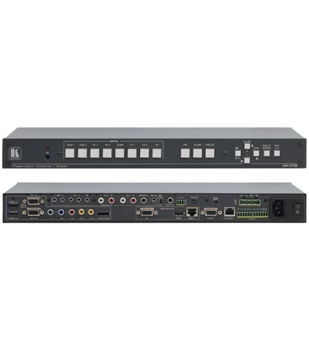 Der VP−770 ist ein Hochleistungs−Präsentationsumschalter und −Scaler für Comp.Video, Komponentenvideo, DisplayPort, Computergrafik und HDMI. Er skaliert Video, koppelt Audio ein und gibt das Signal zusammen mit Digitalaudio, unsymmetrischem Stereo und symmetrischem Stereo mit 2x 10 W als HDMI, Computergrafik und DGKat Twisted Pair aus. K-IIT XL™ Bild-in-Bild Einfügetechnologie - Ultrastabile Bild-in-Bild, Bild-und-Bild und Split-Screen Technik. Jede Videoquelle kann in oder neben eine Computergrafik bzw umgekehrt gesetzt werden mit einstellbarer Position und Größe. Kramers Skalier-Technologie PixPerfect™ - Kramers Präzisions Pixel Mapping und hochwertige Skalier-Technologie. 3:2 und 2:2 Pull Down De-Interlacing und volles Auf- und Abwärts-Skalieren aller Videoeingänge. Extrem schnelle Umschaltung über Schwarz (FTB™) - Videoumschaltungen sind sauber und schnell. Das Bild blendet aus in Schwarz, und das neue Bild wird aus Schwarz weich und ruckfrei eingeblendet. Durch kontinu... ...