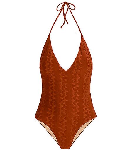 Der Badeanzug „Terracotta Scribble Lido“ besteht aus Jacquard-gewebtem Badefrottee mit strukturierten Wellen, die an Sandstrände erinnern. Es hat einen tiefen Neckholder-Ausschnitt, der im Nacken gebunden wird, einen tiefen Rückenausschnitt und hohe Seitenausschnitte, die Ihre Beine verlängern. Komplett gefüttert. Modischer Damen Badeanzug aus schnelltrocknendem Gewebe Struktur aus Jacquard-gestricktem Frottee Tiefer Ausschnitt vorne und hinten Neckholder Hoher Beinausschnitt Komplett gefüttert Unifarben Farbbezeichnung: Terracotta Scribble Material: 90% Nylon, 10% Elasthan ...