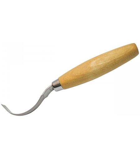Das Schnitzmesser 163 ist mit einem spindelförmigen Griff aus Birkenholz ausgestattet, mit dem es gut und sicher in der Hand liegt. Das Schnitzmesser hat zudem eine gebogene Klinge mit beidseitigem Schliff erhalten, die von Linkshändern wie Rechtshändern verwendet werden kann. Die gebogene Klingenform ist im Unterschied zum klassischen, geraden Messer deutlich besser für Schnitzarbeiten an ausgehöhlten Gegenständen geeignet und bei uns im Shop auch in der stärker gebogenen Variante erhältlich. Damit die Klinge selbst und auch der Rest deiner Ausrüstung im Rucksack geschützt wird, hat das Schnitzmesser 163 eine schützende Lederkappe mit Druckknopfverschluss dabei. Die Klinge besteht übrigens aus rostfreiem Stahl und behält damit ihre Schärfe besonders lang bei. So kannst du deine Schnitzausrüstung mit den speziellen Messern des schwedischen Herstellers aufwerten und auch ausgehöhltes Geschirr, Besteck und andere Dinge aus Holz fertigen. ...