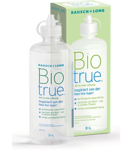 Bei der Entwicklung des All-in-one Pflegemittels Biotrue hat sich Bausch + Lomb von der Biologie des menschlichen Auges inspirieren lassen. Biotrue weist verschiedene Eigenschaften der natürlichen Tränenflüssigkeit auf und ist bestens für weiche Kontaktlinsen geeignet. Dank einer höheren Reinigungsleistung und einer wirksamen Abtötung von Keimen schützt Biotrue Ihre Augen besonders gut. Biotrue liegt mit 7,5 im pH-Bereich der gesunden Tränenflüssigkeit, was zu einem angenehmen Gefühl beim Aufsetzen und Tragen der Kontaktlinsen führt. Es enthält das in der Tränenflüssigkeit vorkommende Benetzungsmittel Hyaluronat, das für eine hohe Spontanverträglichkeit sorgt und die Kontaktlinsen mit einer Art feuchtigkeitsspendenden Kissen umhüllt. Das Hyaluronat kann bis zu 20 Stunden auf den Linsen verbleiben und trägt so dazu bei, dass Tragekomfort und Feuchtigkeit den ganzen Tag lang anhalten. Biotrue hilft, die antibakterielle Wirkung nützlicher Tränenproteine länger zu bewahren und unterstützt damit die natürliche Keimbekämpfung im Auge. Zusätzlich bietet Biotrue eine ausgezeichnete Desinfektion für das Wohlbefinden Ihrer Augen. ...