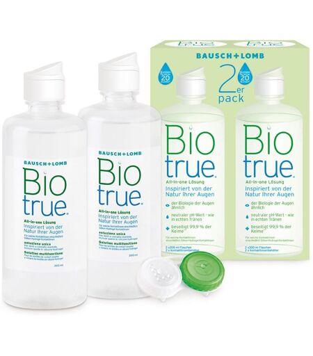Biotrue der neue Pflegemittel-Standard für Kontaktlinsen-Träger mit besonderen Ansprüchen, Inspiriert von der Natur Ihrer Augen. Die neuentwickelte All-in-one Lösung Biotrue von Bausch+Lomb ist eine einzigartige und innovative Kombilösung. Dieses neue Produkt wurde entwickelt, um sich der Funktion Ihres Auges anzupassen. Es reinigt, befeuchtet und sorgt sich um die Gesunderhaltung im Einklang mit den natürlichen Funktionen im Auge. Biotrue wird angewendet für die Pflege, Reinigung, Entfernung von Proteinen, Desinfizieren, Abspülen und Aufbewahren für weiche Kontaktlinsen, inklusive Silikon-Hydrogel Kontaktlinsen. Dabei geht diese neue Pflegelösung vom Markenhersteller Bausch+Lomb weiter als bisherige Pflegemittel für Kontaktlinsen: Es enthält natürliches Hyaluronat als Befeuchter und Gleitmittel für die Linsen. Die Lösung weist einen neutralen pH-Wert auf, welcher dem natürlichem pH-Wert eines gesunden Tränenfilms entspricht und es erhält die gesunden und schützenden Proteine des natürlichen Tränenfilms. Wir empfehlen dieses Produkt uneingeschränkt, falls Sie die beste Pflege für Ihre Kontaktlinsen wünschen und den höchsten Anspruch an Gesundheit Ihrer Augen haben. Ihre Biotrue All-In-One-Vorteile: Premiumprodukt, im natürlichen Einklang mit der Biologie der Augen sehr wirksames, duales Desinfektionssystem erhält und unterstützt den natürlichen Tränenfilm für empfindliche Augen besonders geeignet höchste Wirkung bei hoher Verträglichkeit ...