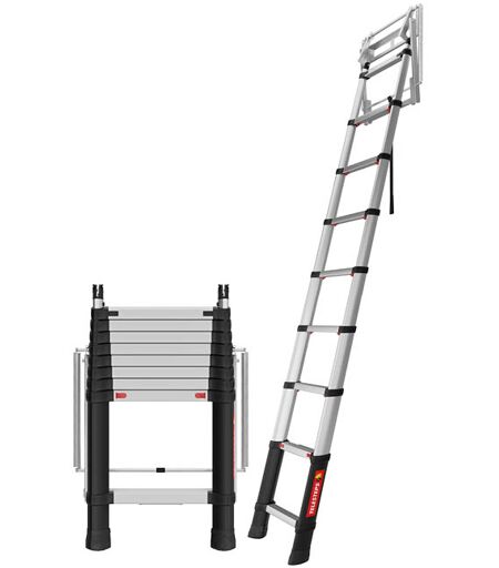 Artikel Telesteps Loft Line Maxi Dachbodenleiter 2,95 m Höhe (72527-541) Anwendung Die Loft Line Mini von Telesteps ist eine sichere Dachbodenleiter, die einfach zu montieren und bequem zu nutzen ist. Die Dachbodenleiter besitzt, wie alle Telesteps Leitern, Sicherheitstasten, tiefe ebene Stufen, angewinkelten Gummifüße und eine sichere Öffnungsfunktion durch die von Telesteps entwickelte Bremstechnologie. Außerdem ist sie mit den dreieckigen Holmen gefertigt, welche die Leiter stabiler und noch stoßfester machen. Die dreieckige Form bietet den perfekten Griff beim Auf- und Absteigen der Leiter.Bei der Nutzung der Dachbodentreppe muss einfach nur die Treppe aus dem Rahmen gezogen und in ihre vollständige Position herausgefahren werden. Nach der Benutzung lässt sie sich mit Hilfe von Autostep® einfach wieder zusammenklappen. Dafür müssen die beiden Knöpfe an der untersten Stufe gedrückt werden und die Leiter entriegelt sich von selbst, während diese eingehängt wird. Material, Eigenschaften und Ausstattung Robuste Konstruktion aus Aluminium für sehr hohen Anspruch an Haltbarkeit Gummikappen an den Füßen gegen unbeabsichtigtes verrutschen Sprossenweise ausziehbar / längenverstellbar Gleitbremse für angenehm sicheres Zusammenfahren Tiefe und ebene Stufen mit gerillten Profilen, um ein Abrutschen zu verhindern Anzahl Stufen 10 Stufentiefe 40 mm Höhe vom Boden bis zur Luke 2,55 - 2,95 m Minimale Lukenöffnung Höhe 2,55 – 2,65 m Länge 92 cm x Breite 52 cm Höhe 2,65 – 2,80 m Länge 100 cm x Breite 52 cm Höhe 2,80 – 2,98 m Länge 110 cm x Breite 52 cm Sicheres Verriegeln durch rote Indikatortasten Zwei Drucktasten zum Schließen der Leiter Autostep® – Automatisches Entriegelungssystem beim Zusammenschieben EN und SP (RISE)-zertifiziert Made in Sweden ...