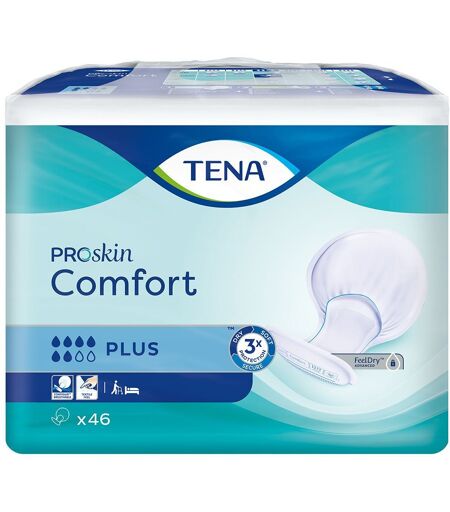 Sichere Einlagen für mittlere bis schwere Inkontinenz Das komfortable Produkt TENA Comfort Plus eignet sich für Menschen, die einen zuverlässigen Inkontinenzschutz mit hoher Saugstärke benötigen, aber weiterhin Vorlagen bevorzugen. Die einzigartige Schalenform bietet sicheren Schutz vor Auslaufen und angenehmen Tragekomfort durch den körpernahen Sitz. Dank FeelDry Advanced™ Technologie wird der Urin schnell von der Oberfläche weggezogen und die Haut trocken gehalten. Der absorbierende Kern schließt selbst größere Mengen Flüssigkeit verlässlich ein und bewahrt das trockene Gefühl. Zugleich lässt das vollständig atmungsaktive ConfioAir™ Rückenpanel die Luft zirkulieren und so die Haut atmen. Diese Eigenschaften tragen dazu bei, die natürliche Gesundheit der Haut zu erhalten. Die Einlage wird durch die wiederverwendbaren, waschbaren TENA Fix Fixierhosen in Position gehalten. Sie kann im Stehen und im Liegen einfach gewechselt werden. TENA ProSkin Comfort ist in verschiedenen Saugstärken verfügbar. Atmungsaktiver Inkontinenzschutz für gesunde Haut Der Erhalt der natürlichen Hautgesundheit stellt eine besondere Herausforderung bei Inkontinenz dar. Zur Förderung gesunder Haut und einem gleichzeitig hohen Tragekomfort hat TENA mit ConfioAir™ einen neuen atmungsaktiven Schutz entwickelt, der das Hautklima auf natürlichem Niveau hält. Das sorgt für ein angenehmeres Hautgefühl bei den Betroffenen, Pflegekräfte bestätigen zudem die bessere Atmungsaktivität und den Schutz der Hautgesundheit*. Die Vorteile von TENA ProSkin Comfort Plus Dreifachschutz für Hautgesundheit: Trockenheit, Sanftheit zur Haut und Auslaufschutz FeelDry Advanced™: Deck- und Verteilerschicht ziehen die Flüssigkeit sofort von der Oberfläche weg und halten die Haut trocken Atmungsaktive Materialien lassen die Luft zirkulieren und unterstützen Hautgesundheit und Komfort Geruchsneutralisierer: Wirkt dauerhaft gegen unangenehme Gerüche Einfacher Wechsel der Vorlage im Stehen und Liegen Dermatologisch getestet und zertifiziert von Skin Health Alliance: TENA ProSkin Comfort wurde von unabhängigen Experten für Hautgesundheit dermatologisch getestet und für gut befunden. Anwendungshinweise https://tena-images.essity.com/images-c5/663/206663/Tena_11_500x500_png/tena-proskin-comfort-usage-instructions.png TENA ProSkin Comfort Plus lässt sich einfach im Stehen und im Liegen wechseln. Zunächst die Einlage der Länge... ...
