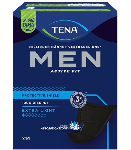 TENA® Men Active Fit Extra Light Diskreter Schutz bei leichtem Harnverlust Einer Harninkontinenz liegen verschiedenste Ursachen zugrunde, meistens ist der Harnverlust jedoch durch eine schwache Beckenbodenmuskulatur, Übergewicht, Alter oder eine vergrößerte Prostata bedingt. Unfreiwilliger Harnverlust ist häufiger vertreten als man denkt, denn jeder vierte Mann über 40 ist hiervon betroffen*. TENA® Men bietet ein umfassendes Sortiment diskreter, saug fähiger und komfortabler Produkte speziell für die Anforderungen von Männern. TENA® Men Active Fit Extra Light ist eine speziell konzipierte Einlage für den Verlust einzelner Tropfen. Zudem schützt sie auch bei Nachtröpfeln. Als dünnes, schwarzes Shield sitzt TENA® Men Active Fit Extra Light sicher in der eigenen Unterwäsche mit bequemer Tragfähigkeit. Praktisch für unterwegs: Die einzeln verpackten Shields passen in jede Hosentasche und können diskret entsorgt werden. Leicht und zuverlässig Inkontinenz ist ein unangenehmes Thema. Wichtig ist daher ein diskreter und sicherer Schutz in jeder Lebenslage. TENA® Men Active Fit Extra Light eignet sich bei leichtem Harnverlust bei Männern. Der stark absorbierende Saugkern aus Polymer schließt einzelne Tropfen sofort ein und verhindert ein Nässegefühl. Dank der einzigartigen Odour Control Technologie werden unangenehme Gerüche sicher neutralisiert. Als sehr dünne, schwarze Einlage mit Klebestreifen, sitzt sie diskret in der Unterwäsche und bietet angenehmen Tragekomfort. Zum Schutz der Haut sind alle Materialien dermatologisch getestet. Ultra dünne Einlagen für Männer Idealer Schutz bei Verlust einzelner Tropfen und Nachtröpfeln Sicherer und bequemer Sitz in der Unterwäsche Speziell entwickelt für die männliche Anatomie In umweltfreundlicher Einzelverpackung LANGJÄHRIGE ERFAHRUNG UND KOMPETENZ TENA bietet seit mehr als 50 Jahren vielfältige Produkte und Leistungen für Menschen mit Inkontinenz und Einrichtungen im Gesundheitswesen in 90 Ländern. Mit hohem Engagement und Qualitätsbewusstsein werden kontinuierlich innovative Hilfsmittel und Lösungen entwickelt, damit Menschen mit Harnverlust und Inkontinenz ihren Alltag möglichst uneingeschränkt meistern können. INKONTINENZ BEI MÄNNERN Harninkontinenz äußert sich bei Männern häufig durch unkontrollierten Harnverlust bei körperlicher Belastung oder verstärkten Harndrang. Je nach Ursache und Aus prägung der Erkrankung können verschiedene Behand lungsmethoden die Beschwerden beseitigen oder zu mindest deutlich lindern. AKTIV TROTZ HARNVERLUST Unkontrollierter Harndrang sollte keinen Mann von einem aktiven Leben abhalten. Diskrete Einlagen mit zu verlässigem Schutz und wirksamer Geruchskontrolle sorgen für ein sicheres Gefühl in jeder Situation – im beruflichen Leben ebenso wie bei allen sportlichen Aktivitäten und Feiern mit Freunden und Familie. HÄUFIGER HARNDRANG Ein plötzlicher, unerwarteter Harndrang kann zwar die Folge von zu viel Kaffee oder Alkohol sein, tauchen die Beschwerden aber vermehrt... ...