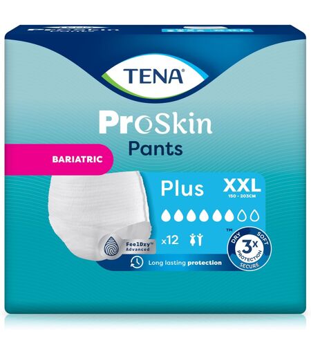 Zuverlässige Inkontinenzversorgung bei Adipositas Starkes Übergewicht kann die Kontrolle der Blasenfunktion beeinträchtigen, zudem neigen adipöse Menschen eher zu Hautproblemen. Diesen Herausforderungen hat sich TENA® angenommen und mit dem Bariatric Sortiment innovative Produkte entwickelt, die eigens auf die Bedürfnisse adipöser Verwender ausgerichtet sind. Zuverlässige Inkontinenzversorgung bei Adipositas Dank der elastischen Materialien lässt TENA Pants Bariatric Plus sich einfach an- und ausziehen und fühlt sich an wie normale Unterwäsche – für mehr Unabhängigkeit des Trägers. Für mittlere Blasenschwäche bei Übergewicht TENA® Pants Bariatric Plus wurde speziell für inkontinente Menschen mit starkem Übergewicht konzipiert. Die Einweg-Inkontinenzhose ist komplett atmungsaktiv und ermöglicht eine individuelle Anpassung für einen optimalen und rutschfesten Sitz. Die Kombination aus flexiblen Stretch-Einsätzen und elastischen Beinöffnungen gewährleistet eine körpernahe und bequeme Passform. Die atmungsaktiven, textilähnlichen Seitenteile des Inkontinenzschutzes halten die Haut durch gute Luftzirkulation trocken und unterstützen die natürliche Gesundheit der Haut. Dank der FeelDry Technologie werden selbst große Mengen Flüssigkeit sehr schnell in den Saugkern geleitet. Dort bleibt der Urin sicher eingeschlossen, sogar unter Druck. Das bedeutet mehr Komfort und ist ein entscheidender Schritt zu besserer Hautgesundheit. Die Vorteile von TENA Pants Bariatric Plus Hervorragende Passform und Atmungsaktivität: Das Produkt ist komplett atmungsaktiv und passt sich ganz sanft den Körperkonturen an Dreifachschutz für Trockenheit, Sanftheit zur Haut und Auslaufschutz zum Erhalt der natürlichen Hautgesundheit Lang anhaltende Trockenheit durch ultraschnelles Aufsaugen und hochabsorbierendem Kern Einfacher Wechsel dank der Seitenverschlüsse Odour Neutralizer reduziert den unangenehmen Ammoniakgeruch und erhält das Gefühl von Frische und Würde Dermatologisch getestet Angaben zu Produktgröße und Saugstärke befinden sich gut lesbar auf der Rückseite des Produkts, auch im zusammengefalteten Zustand im Regal sichtbar Anwendung: Legen Sie die längsgefaltete Schutzhose von vorne nach hinten zwischen den Beinen hindurch an. Ziehen Sie die Vorderseite der Schutzhose mit Zick-zack-Bewegungen an Fixieren Sie erst nacheinander die beiden unteren Klettverschlüsse, und dann die oberen Verschlüsse. Die Klettverschlüsse können wiederholt befestigt und angepasst werden ...