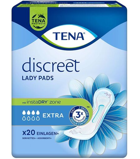 TENA Lady Discreet Extra Einlagen sind für mittlere Blasenschwäche geeignet. Eigenschaften von TENA Lady Discreet Extra • Ideale Befestigung dank breitem Klebestreifen • Körpergerechte Passform und spezielle Silky Softness Oberfläche für ein optimales Tragegefühl • Der Dry Fast Core™ Saugkern schließt Flüssigkeit sicher ein • Schnelles Trocknen der Einlage dank QuickDry Oberfläche • Fresh Odour Control™ Geruchsneutralisierer sowie besondere Mikro-Frischeperlen verhindern unangenehme Gerüche und Bakterien TENA Lady Extra Einlagen: Sicherheit, Diskretion & Tragekomfort Was TENA Lady Discreet so besonders macht? Diese Frage lässt sich leicht beantworten. Denn im Vergleich zu herkömmlichen Einlagen überzeugt die TENA Lady Extra Slipeinlage unter anderem mit ihrer höheren Saugfähigkeit. Diese schützt nicht nur vor dem Auslaufen, sondern auch vor Feuchtigkeit und unangenehmer Geruchsbildung. Das Ergebnis ist ein angenehm trockenes Hautgefühl sowohl am Tag als auch in der Nacht. Eine optimale Passform, die neben Durchlässigkeit auch Unbequemlichkeit verhindert, ist ein weiteres Markenzeichen von TENA Lady Discreet Extra. Zu verdanken ist diese unter anderem den kaum spürbaren elastischen Seitenbündchen, die sich ohne Einbußen von Sicherheit und Wohlbefinden mühelos jeder Bewegung anpassen. Einen umfassenden Schutz bieten die zeitgemäßen Slipeinlagen folglich auch aktiven Damen. Ob im Beruf, im Alltag oder in der Freizeit: Die TENA Lady Extra Einlagen werden einzeln verpackt geliefert und erweisen sich so rund um die Uhr als unkomplizierter und darüber hinaus nahezu unsichtbarer Begleiter, der in jede Handtasche passt. Weiches, atmungsaktives Material wiederum garantiert maximale Hautfreundlichkeit und Verträglichkeit bei anhaltendem Frischegefühl. Jede einzelne Slipeinlage ist in etwa 34 cm lang, 12,1 cm breit und 1,1 cm dünn. Das aufgedruckte Muster verleiht ihr eine besonders feminine Note. Erhältlich ist TENA Lady Discreet Extra in Packungsgrößen zu jeweils 20 Stück. ...