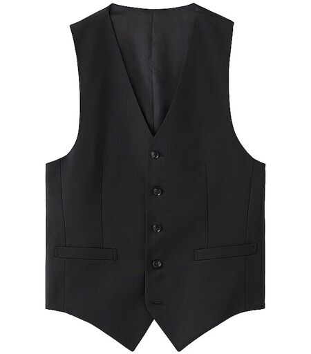 Herren Anzugweste aus recycelter Polyester-Woll-Mischung mit Leinwandbindung V-Ausschnitt Ohne Arm Verschluss mit fünf Knöpfen Abnäher für extra definierte Silhouette Gerade Passform Zwei Eingriffstaschen auf der Vorderseite Unifarben Farbbezeichnung: Black Material: 54 % recyceltes Polyester, 44 % Wolle, 2 % Elasthan ...