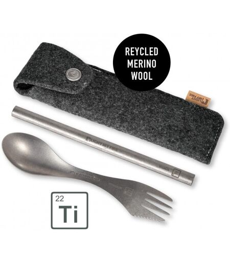 Das Spork'n Straw Kit Titanium begleitet dich durch den Alltag und deine Outdoorabenteuer und kommt immer dann zum Einsatz, wenn sich Hunger oder Durst melden. Der robuste Trinkhalm macht dabei mit seinen pflegeleichten Eigenschaften und seinem schicken Design jeden Wegwerfstrohhalm überflüssig. Die Gabel-Löffel Kombination im Spork'n Straw Kit Titanium ist ohnehin ein Klassiker der Outdoorküche und eignet sich mit seinem kompakten Format auch perfekt für das Mittagessen im Büro oder das Picknick im Park. Das hochwertige Titanbesteck wird darüber hinaus in einer nachhaltigen, schicken Hülle mit Druckknopf geliefert, die zu mindestens 50 % aus Wolle besteht. Dafür hat der Hersteller sich an seinen schwedischen Kollegen Woolpower gewandt, die hierfür ihre Produktionsreste zur Verfügung stellen. So kannst du Abfall vermeiden und bekommst ein langlebiges, nachhaltiges Produkt, das sich zudem hervorragend als Geschenk eignet. ...
