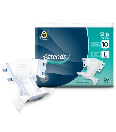 Attends Slip Regular bieten das Extra an Sicherheit in der Inkontinenzversorgung.Der leistungsstarke zweifache Saugkern mit Superabsorber steht für hervorragende Saugleistung und sicheres Einschließen von Flüssigkeit und unangenehmen Gerüchen.Er sorgt somit für einen hautgesunden pH-Wert und ein trockenes Tragegefühl.Mikroskopisch kleine Poren in der Außenseite der Produkte lassen die Luft zirkulieren.Komfortable Klettverschlüsse erleichtern das An- und Ablegen. Anwendung:Sichere Versorgung bei vollständiger Harn- und Stuhlinkontinenz.Auch für bettlägerige Personen geeignet. ...