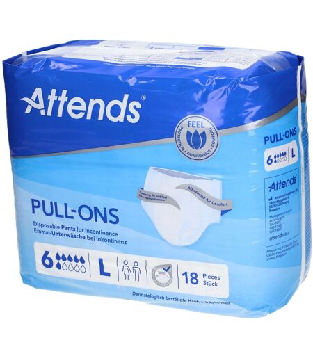 Verbesserte Qualität - erweitertes Sortiment! Die Pull-Ons 6 löst die Pull-Ons 5 ab!Die neuen saugstarken Attends Pull-Ons die sie sich wie Unterwäsche anfühlen. Verbessertes Sortiment im neuen Verpackungsdesign. Neue Saugstärken 4 - 6 - 8 und 10! Attends Pull-Ons 6 ist eine saugfähige Einmalhose die bei leichter bis mittlerer Blasenschwäche geeignet ist. Die Pants kann wie eine normale Unterwäsche an- und ausgezogen werden. Für eine optimale Hauttrockenheit sorgt ein leistungsfähiger doppelter Saugkern. Die Seitenbündchen bieten Schutz und Sicherheit. Aufgrund der stoffähnlichen atmungsaktiven Materialien wird ein angenehmer Tragekomfort und eine besondere Hautfreundlichkeit gewährleistet. Die Attends Pull-Ons 6 ist diskret zu tragen und eignet sich speziell für mobile und aktive Menschen.Vorteile von Attends Pull-Ons 6 latexfrei die Verpackung besteht aus mind. 30% recyceltem Kunststoff Seitenbündchen mit Auslaufschutz Odour Protection - vermeidet unangenehme Gerüche und sorgt für Trockenheit Aktivzone für extra Saugfähigkeit im Schrittbereich stoffähnliche atmungsaktive Materialien rundum elastischer Bund sorgt für anschmiegsamen Sitz und verbesserten Schutz noch weicher durch Ultraschallverschweißen - Nähte ohne Klebstoff Dank niedrigerer Taille noch unauffälliger unter der Alltagskleidung 100% luftdurchlässige Außenseite sorgt für rundum angenehmen Tragekomfort Der Nässeindikator zeigt durch Verschwimmen an wann das Produkt gewechselt werden sollte. Hautverträglichkeit von proDerm bestätigt bei leichter bis mittlerer Blasenschwäche geeignet Inhalt: Verschiedene Stückzahlen je Größe! Informationen zur Pull-Ons Umstellung Attends Pull-Ons Umstellung Attends Pull-Ons Größen Größe Hüftumfang S 60 - 90 cm M 80 - 110 cm L 100 - 140 cm XL 130 - 170 cm Attends Pull-Ons im Vergleich Variante Saugstärke MDS (g) Größe Pull-Ons 4 594 587 586 606 SM L XL Pull-Ons 6 876 780 793 765 827 829 XXSXS S ML XL Pull-Ons 8 1.172 1.149 1.130 1.128 S M L XL Pull-Ons 10 1.474 1.3421.336 M L XL ...