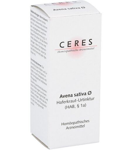 Wirkstoffe / Inhaltsstoffe / Zutaten1 ml Avena sativa (hom./anthr.)Ethanol Hilfstoff (+)Zu Risiken und Nebenwirkungen lesen Sie die Packungsbeilage und fragen Sie Ihre Ärztin, Ihren Arzt oder in Ihrer Apotheke.Ceres Avena sativa Urtinktur sind apothekenpflichtig und können in Ihrer Versandapotheke www.apolux.de erworben werden. ...