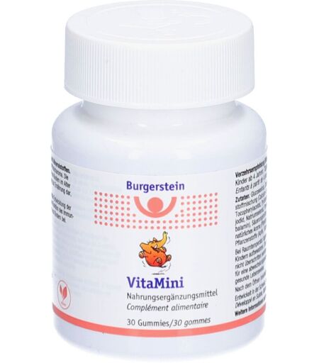Nahrungsergänzungsmittel sind kein Ersatz für eine ausgewogene und abwechslungsreiche Ernährung und eine gesunde Lebensweise. Burgerstein VitaMini Gummies sind ein Nahrungsergänzungsmittel für Kinder ab 4 Jahren, das zur Unterstützung von Wachstum, Immunsystem und kognitiver Entwicklung beiträgt. Die leckeren Gummies enthalten 9 essentielle Vitamine und 3 Spurenelemente, darunter Vitamin D für die Knochenentwicklung, Zink für die kognitive Funktion und Vitamin C für die Immunabwehr. Mit natürlichem Pfirsichgeschmack, ohne künstliche Farb-, Aroma- oder Süßstoffe.Zutaten: Glucosesirup, Zucker, modifizierte Stärke, Vitamin- und Mineralstoffmischung (Calcium-L-ascorbat, Zinkcitrat, Nicotinamid, d-alpha-Tocopherylacetat, Pyridoxinhydrochlorid, Pteroylglutaminsäure, Kaliumjodid, Natriumselenat, Phyllochinon, D-Biotin, Cholecalciferol (Cyano-cobalamin)), Säuerungsmittel (Apfelsäure), Säureregulator (Natriumcitrat), natürliches Aroma (Pfirsich), Überzugsmittel (Carnaubawachs), farbgebende Pflanzenstoffe (Apfel, Färberdistel, Karotte).Verzehrempfehlung: Täglich 1 Gummie kauen. Geeignet für Kinder ab 4 Jahren.Hinweise & Aufbewahrung: Nahrungsergänzungsmittel sind kein Ersatz für eine ausgewogene Ernährung. Die empfohlene Tagesdosis nicht überschreiten. Außerhalb der Reichweite von Kindern aufbewahren. Bei Raumtemperatur lagern. Nach dem Öffnen innerhalb von ca. 2 Monaten verbrauchen.Nettofüllmenge: 30 Stück (Gummies)Hersteller: Burgerstein Vitamine Schweiz ...