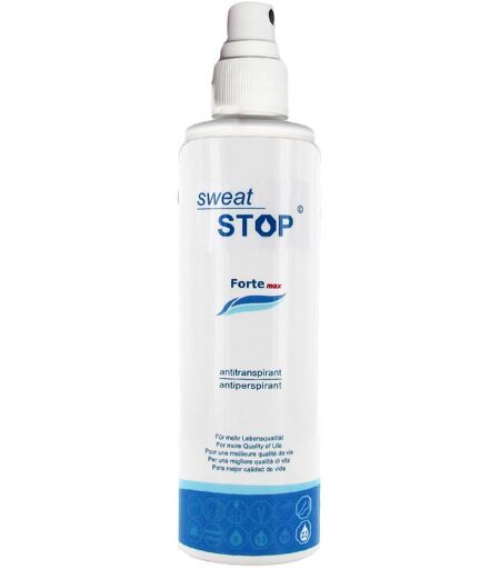 SweatStop® Antitranspirant Forte max Fußspray gegen Schweiß- und Geruchsbildung an den Füßen.Bietet 24 Stunden lang Sicherheit gegen feuchte Füße.Mit SweatStop®Forte max Upside Down gegen Schweiß- und Geruchsbildung an den Füßen fühlen Sie sich 24 Stunden lang sicher.Mit dem speziell entwickelten Upside Down Pumpsystem wird eine mühelose Anwendung an den Füßen ermöglicht.Optimal in Kombination mit SweatStop® Instant, welches bei Bedarf aufgetragen werden kann und die Füße sofort trocknet.Für Sie und IhnAnwendungsbereiche: FüßeIn Ausnahmefällen (bei Nichterfolg mit SweatStop® Aloe Vera Forte plus Upside Down) auch für weitere schwer zugängliche Hautbereiche wie z.B. dem Rücken anwendbarAnzuwenden auf einer gesunden HautDie Vorteile auf einen BlickGegen Schweiß- und GeruchsbildungUpside Down Pumpsystem für eine mühelose Anwendung an den FüßenDermatologisch auf Hautverträglichkeit getestet; Prädikat Institut Dermatest „sehr gut”Inhalt ist ausreichend für mehrere Monate AnwendungBietet 24-72 Stunden lang Sicherheit GeruchsneutralHinweis:weatStop® Forte max Fußspray reduziert die Schweißbildung an den Füßen für 24 Stunden.Da die Haut an den Füßen dicker ist als beispielsweise an den Achseln, können Flüssigkeiten und somit auch SweatStop®-Antitranspirante nicht in gleicher Weise einziehen.Daher kann der schweißreduzierende Effekt verzögert eintreten.Die Anwendung erfolgt unmittelbar vor dem Schlafengehen.Das Spray ist aufzusprühen und gut einzumassieren, dies kann bis zu 5 Mal wiederholt werden.GebrauchsanweisungUm gegen Schweiß- und Geruchsbildung vorgehen zu können, müssen SweatStop® Antitranspirante unmittelbar vor dem Schlafengehen auf saubere und absolut trockene Haut aufgetragen werden.Damit die Lösung ungehindert einziehen kann und die Salze die Poren verschließen können, muss darauf geachtet werden, dass es nach dem Auftragen nicht mehr zum Schwitzen kommt.Die Anwendung ist alle 2-3 Tage zu wiederholen.Morgens kann der gewohnten Waschroutine nachgegangen werden und nach Wunsch auch ein Deodorant oder eine hautpflegende Creme auftragen werden.Der Effekt entfaltet sich nach 1-3 Anwendungen, in seltenen Fällen werden mehrere Anwendungen benötigt.Vor dem Schlafengehen betroffene Hautpartie reinigen und trocknenEinmal gezielt aufsprühenVor dem Bekleiden vollständig trocknen lassen, damit keine Flecken entstehen Achtung! Für alle SweatStop® Antiranspirante gilt:Nach dem Auftragen vermeiden, was die Schweißbildung während der folgenden Stunden begünstigen könnte Kontakt mit Augen, Mund und irritierter oder verletzter Haut vermeidenEntsprechenden Hautbereich mindestens 48 Stunden vor und 12 Stunden nach Awendung nicht rasierenUnmittelbar vor dem Schlafengehen auftragen, gut eintrocknen lassen, um auch Flecken auf der Kleidung zu vermeidenDarf nicht in die Hände von Kindern gelangenEigenschaften einiger Inhaltsstoffe von SweatStop® Forte... ...