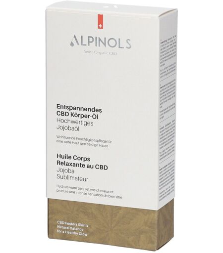 ALPINOLS Entspannendes CBD Körper-Öl Für das entspannende CBD Körper-Öl hat ALPINOLS ein Full Spectrum CBD-Extrakt mit einem premium Jojoba-Öl kombiniert. Dank der natürlichen Inhaltsstoffe ist das Körper-Öl eine reichhaltige und feuchtigkeitsspende Pflege für Ihre Haut. Es eignet sich auch bestens als Massage-Öl und weiter kann es Haar-Öl verwendet werden. Die enthaltenen Terpene wirken wie eine Aromatherapie für die Sinne und tragen zum Verwöhnmoment und zur Entspannung bei. Hochwertige CBD-Kosmetik mit praktischem Pumpsystem Reichhaltiges Haut-und Haaröl Bio Full-Spectrum-CBD Extrakt aus eigener Herstellung Natürliche Terpene (Aromastoffe aus dem Hanf) Wertvolles Premium Bio Jojoba-Öl 100 Prozent natürlich Swiss Made Anwendung Massieren Sie das Öl sanft auf Ihren Körper und / oder Gesicht, wann immer Sie tiefe Entspannung und nahrhafte Pflege der Haut wünschen. Als Haaröl vor der Haarwäsche angewendet, schützt das Öl Ihr Haar vor Austrocknen, Bruch und Spliss. Das CBD Körper-Öl mit seinem angenehmen Duft eignet sich hervorragend für verwöhnende Massagen. So kann es dabei helfen, die Muskeln zu entspannen, spendet Feuchtigkeit und sorgt für eine weiche Haut. Dementsprechend ist das Öl nicht nur bei der Massage eine Wohltat, sondern bietet auch danach noch eine reichhaltige Körperpflege. Da das Körper-Öl sehr ergiebig ist, reicht bereits eine kleine Menge aus. Einfach das wohlduftende Öl in den Handflächen verteilen und in langsamen kreisenden Bewegungen auf die Haut auftragen – entweder am ganzen Körper oder nur an ausgewählten Stellen. Darüber hinaus ist das Öl eine ideale Haarpflege, vor allem bei trockenem und brüchigem Haar. Einfach das Öl in die strapazierten Längen und Spitzen einmassieren, etwa eine halbe Stunde einwirken lassen und mit warmem Wasser auswaschen. Zusammensetzung SIMMONDSIA CHINENSIS SEED OIL (Bio Jojoba oil) CANNABIS SATIVA LEAF EXTRACT (Bio Full Spectrum Extract) ...