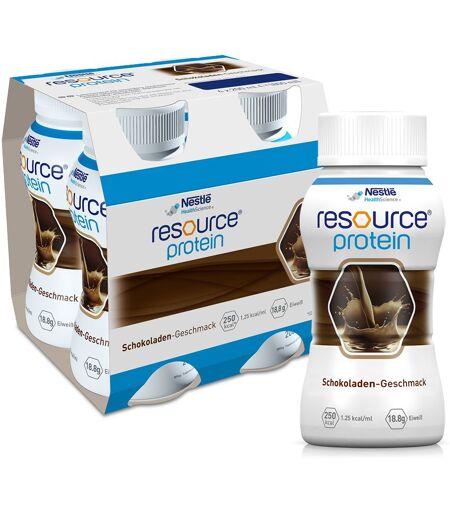 Nahrungsergänzungsmittel sind kein Ersatz für eine ausgewogene und abwechslungsreiche Ernährung und eine gesunde Lebensweise.resource® protein Schokolade Hochkalorische Trinknahrung, reich an Eiweiß Aufbaukost bei MangelernährungGenießen Sie den leckeren Geschmack von resource® protein Schkolade – die hochkalorische und proteinreiche Trinknahrung zum Diätmanagement bei bestehender Mangelernährung oder bei Risiko für eine Mangelernährung. Eine Flasche (200 ml) dieser medizinischen Trinknahrung liefert 250 kcal sowie 18,8 g Eiweiß und enthält alle wichtigen Nährstoffe wie Vitamine und Mineralstoffe. resource® protein Schokolade eignet sich besonders gut für Patient:innen mit erhöhtem Eiweißbedarf. resource® protein mit Schokoladengeschmack.Diese Trinknahrung eignet sich sowohl zur ergänzenden als auch zur ausschließlichen Ernährung und enthält keine Ballaststoffe. resource® protein Schokolade schmeckt gekühlt am besten und kann leicht in den Alltag integriert werden. Lagern Sie das Produkt kühl und trocken, und schütteln Sie es gut vor dem Verzehr.Häufige Fragen:Wie viele Flaschen resource® protein sollte ich pro Tag trinken?Zur ergänzenden Ernährung sind täglich 1 – 3 Flaschen resource® protein zusätzlich zu Ihrer normalen Ernährung empfohlen. Achten Sie jedoch bitte darauf, die Dauer der Anwendung und Menge von resource® Trinknahrung - insbesondere bei ausschließelicher Ernährung - immer mit Ihrem Arzt zu besprechen. Wie nehme ich resource® Trinknahrungen zu mir?Für den besten Genuss empfehlen wir, resource® protein gekühlt zu trinken. Bitte schütteln Sie die Flasche vor dem Trinken gut durch. Die geöffnete Flasche wiederverschließen, im Kühlschrank aufbewahren und innerhalb von 24 Stunden verzehren.Für wen ist resource® protein geeignet?resource® protein ist geeignet ab 3 Jahren und für Personen mit Mangelernährung, ungewolltem Gewichtsverlust und/oder erhöhtem Energie- und Eiweißbedarf, wie etwa bei chronischen/konsumierenden Erkrankungen, nach Operationen, bei Dekubitus, gestörter Wundheilung oder altersbedingtem Muskelabbau.Kann ich resource® Trinknahrungen mit anderen Getränken oder Lebensmitteln mischen?Ja, Sie können resource® protein ganz nach Ihrem Geschmack mit anderen Getränken/Speisen mischen oder auch in Rezepten verarbeiten, z.B. als Soße zum Dessertgericht oder in den (Eis-)Kaffee als Milchersatz. Kann ich resource® Trinknahrungen erhitzen?resource® protein kann bedenkenlos bis maximal 40 °C erwärmt werden. Kann resource® protein vom Arzt verordnet werden?Ja, resource® protein Trinknahrung kann bei bestehender Mangelernährung oder bei Risiko für eine Mangelernährung zu Lasten der gesetzlichen Krankenkasse vom Arzt verordnet werden.Fußnote 1 Für resource® 2.0+fibre Neutraler Geschmack und resource® UTLRA fruit Orangen-Geschmack (im Vergleich zu den getesteten Wettbewerbsprodukten). Semimonadischer Produkttest n=73, Alter 65+, getestet wurden resource® 2.0+fibre Neutraler-/Kaffee-Geschmack, resource® energy Schokoladen-Geschmack,... ...