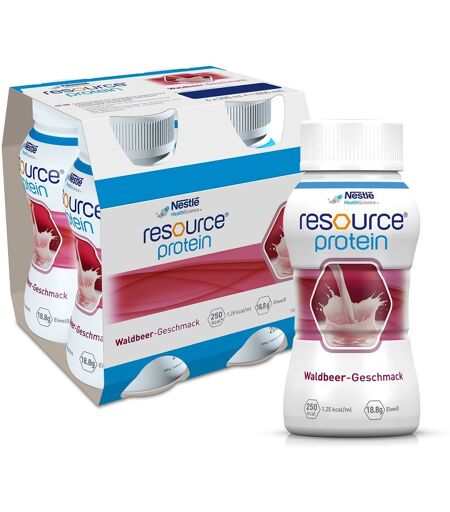 Nahrungsergänzungsmittel sind kein Ersatz für eine ausgewogene und abwechslungsreiche Ernährung und eine gesunde Lebensweise.resource® protein Waldbeere Hochkalorische Trinknahrung, reich an Eiweiß Aufbaukost bei MangelernährungGenießen Sie den leckeren Geschmack von resource® protein Waldbeere – die hochkalorische und proteinreiche Trinknahrung zum Diätmanagement bei bestehender Mangelernährung oder bei Risiko für eine Mangelernährung. Eine Flasche (200 ml) dieser medizinischen Trinknahrung liefert 250 kcal sowie 18,8 g Eiweiß und enthält alle wichtigen Nährstoffe wie Vitamine und Mineralstoffe. resource® protein Waldbeere eignet sich besonders gut für Patient:innen mit erhöhtem Eiweißbedarf. resource® protein mit Vanillegeschmack.Diese Trinknahrung eignet sich sowohl zur ergänzenden als auch zur ausschließlichen Ernährung und enthält keine Ballaststoffe. resource® protein Vanille schmeckt gekühlt am besten und kann leicht in den Alltag integriert werden. Lagern Sie das Produkt kühl und trocken, und schütteln Sie es gut vor dem Verzehr.Häufige Fragen:Wie viele Flaschen resource® protein sollte ich pro Tag trinken?Zur ergänzenden Ernährung sind täglich 1 – 3 Flaschen resource® protein zusätzlich zu Ihrer normalen Ernährung empfohlen. Achten Sie jedoch bitte darauf, die Dauer der Anwendung und Menge von resource® Trinknahrung - insbesondere bei ausschließelicher Ernährung - immer mit Ihrem Arzt zu besprechen. Wie nehme ich resource® Trinknahrungen zu mir?Für den besten Genuss empfehlen wir, resource® protein gekühlt zu trinken. Bitte schütteln Sie die Flasche vor dem Trinken gut durch. Die geöffnete Flasche wiederverschließen, im Kühlschrank aufbewahren und innerhalb von 24 Stunden verzehren.Für wen ist resource® protein geeignet?resource® protein ist geeignet ab 3 Jahren und für Personen mit Mangelernährung, ungewolltem Gewichtsverlust und/oder erhöhtem Energie- und Eiweißbedarf, wie etwa bei chronischen/konsumierenden Erkrankungen, nach Operationen, bei Dekubitus, gestörter Wundheilung oder altersbedingtem Muskelabbau.Kann ich resource® Trinknahrungen mit anderen Getränken oder Lebensmitteln mischen?Ja, Sie können resource® protein ganz nach Ihrem Geschmack mit anderen Getränken/Speisen mischen oder auch in Rezepten verarbeiten, z.B. als Soße zum Dessertgericht oder in den (Eis-)Kaffee als Milchersatz. Kann ich resource® Trinknahrungen erhitzen?resource® protein kann bedenkenlos bis maximal 40 °C erwärmt werden. Kann resource® protein vom Arzt verordnet werden?Ja, resource® protein Trinknahrung kann bei bestehender Mangelernährung oder bei Risiko für eine Mangelernährung zu Lasten der gesetzlichen Krankenkasse vom Arzt verordnet werden.Fußnote 1 Für resource® 2.0+fibre Neutraler Geschmack und resource® UTLRA fruit Orangen-Geschmack (im Vergleich zu den getesteten Wettbewerbsprodukten). Semimonadischer Produkttest n=73, Alter 65+, getestet wurden resource® 2.0+fibre Neutraler-/Kaffee-Geschmack, resource® energy Schokoladen-Geschmack,... ...