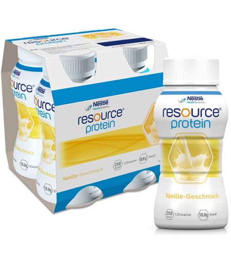 Nahrungsergänzungsmittel sind kein Ersatz für eine ausgewogene und abwechslungsreiche Ernährung und eine gesunde Lebensweise.resource® protein Vanille Hochkalorische Trinknahrung, reich an Eiweiß Aufbaukost bei MangelernährungGenießen Sie den leckeren Geschmack von resource® protein Vanille – die hochkalorische und proteinreiche Trinknahrung zum Diätmanagement bei bestehender Mangelernährung oder bei Risiko für eine Mangelernährung. Eine Flasche (200 ml) dieser medizinischen Trinknahrung liefert 250 kcal sowie 18,8 g Eiweiß und enthält alle wichtigen Nährstoffe wie Vitamine und Mineralstoffe. resource® protein Vanille eignet sich besonders gut für Patient:innen mit erhöhtem Eiweißbedarf. resource® protein mit Vanillegeschmack.Diese Trinknahrung eignet sich sowohl zur ergänzenden als auch zur ausschließlichen Ernährung und enthält keine Ballaststoffe. resource® protein Vanille schmeckt gekühlt am besten und kann leicht in den Alltag integriert werden. Lagern Sie das Produkt kühl und trocken, und schütteln Sie es gut vor dem Verzehr.Häufige Fragen:Wie viele Flaschen resource® protein sollte ich pro Tag trinken?Zur ergänzenden Ernährung sind täglich 1 – 3 Flaschen resource® protein zusätzlich zu Ihrer normalen Ernährung empfohlen. Achten Sie jedoch bitte darauf, die Dauer der Anwendung und Menge von resource® Trinknahrung - insbesondere bei ausschließelicher Ernährung - immer mit Ihrem Arzt zu besprechen. Wie nehme ich resource® Trinknahrungen zu mir?Für den besten Genuss empfehlen wir, resource® protein gekühlt zu trinken. Bitte schütteln Sie die Flasche vor dem Trinken gut durch. Die geöffnete Flasche wiederverschließen, im Kühlschrank aufbewahren und innerhalb von 24 Stunden verzehren.Für wen ist resource® protein geeignet?resource® protein ist geeignet ab 3 Jahren und für Personen mit Mangelernährung, ungewolltem Gewichtsverlust und/oder erhöhtem Energie- und Eiweißbedarf, wie etwa bei chronischen/konsumierenden Erkrankungen, nach Operationen, bei Dekubitus, gestörter Wundheilung oder altersbedingtem Muskelabbau.Kann ich resource® Trinknahrungen mit anderen Getränken oder Lebensmitteln mischen?Ja, Sie können resource® protein ganz nach Ihrem Geschmack mit anderen Getränken/Speisen mischen oder auch in Rezepten verarbeiten, z.B. als Soße zum Dessertgericht oder in den (Eis-)Kaffee als Milchersatz. Kann ich resource® Trinknahrungen erhitzen?resource® protein kann bedenkenlos bis maximal 40 °C erwärmt werden. Kann resource® protein vom Arzt verordnet werden?Ja, resource® protein Trinknahrung kann bei bestehender Mangelernährung oder bei Risiko für eine Mangelernährung zu Lasten der gesetzlichen Krankenkasse vom Arzt verordnet werden.Fußnote 1 Für resource® 2.0+fibre Neutraler Geschmack und resource® UTLRA fruit Orangen-Geschmack (im Vergleich zu den getesteten Wettbewerbsprodukten). Semimonadischer Produkttest n=73, Alter 65+, getestet wurden resource® 2.0+fibre Neutraler-/Kaffee-Geschmack, resource® energy Schokoladen-Geschmack, resource®... ...