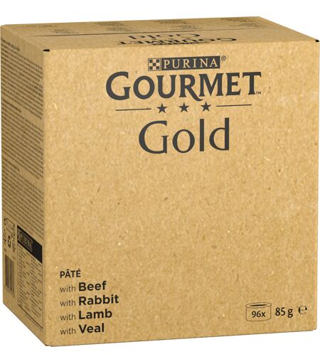 96 x 85 g Jumbopack: Gourmet Gold Feine Pastete: Rind, Kaninchen, Lamm, Kalbfleisch Nassfutter Katze