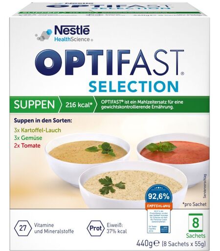 Bitte achten Sie auf eine abwechslungsreiche und ausgewogene Ernährung und eine gesunde Lebensweise.OPTIFAST® SELECTION Egal, ob Gewicht halten oder endlich wieder Wohlfühl-Body dein Ziel ist: Das umfassende Sortiment der Optifast® Diet Selection kann beides! Sie liefert dir bei nur max. 250 kcal pro Portion eine große Geschmacksvielfalt von lecker-cremig bis herzhaft-würzig. Als vollwertiger Mahlzeitersatz für eine gewichtskontrollierende Ernährung erfüllt die Zusammensetzung hohe rechtliche Anforderungen und ist nicht mit handelsüblichen Proteinprodukten vergleichbar.Entdecke auch du deinen persönlichen Lieblingsgeschmack und starte jetzt mit Optifast® durch.Eine Auswahl aus 3 Köstlichen Suppen: 3x Kartoffel-Lauch 3x Gemüse 2 TomateZutaten Kartoffel Lauch:Milcheiweiß, Magermilchpulver, pflanzliche Öle, enthalten Milcheiweiß (Raps, Sonnenblume), getrocknetes Gemüse (8,8%) (Kartoffel, Lauch, Spinat), Ballaststoffe (Gummi arabicum, Fructo-Oligosaccharide, Inulin), Mineralstoffe (Kaliumcitrat, Magnesiumcitrat, Kaliumphosphat, Calciumcarbonat, Eisensulfat, Zinksulfat, Kupfergluconat, Mangansulfat, Natriumfluorid, Natriumselenit, Chromchlorid, Natriummolybdat, Kaliumiodid), Maltodextrin, Aroma, Fischöl (enthält Sojalecithin, Milchprotein), Geschmacksverstärker (Mononatriumglutamat), Vitamine (Niacin, E, Pantothensäure, C, B6, Thiamin, Riboflavin, A, Folsäure, K, Biotin, D, B12), getrockneter Schnittlauch, Farbstoff (KurkuminZutaten Gemüse:Milcheiweiß, Magermilchpulver, pflanzliche Öle, enthalten Milcheiweiß (Raps, Sonnenblume), getrocknetes Gemüse (7,2%) (Kartoffel, Tomate, Lauch, Karotte, Zwiebel), Ballaststoffe (Gummi arabicum, Fructo-Oligosaccharide, Inulin), Mineralstoffe (Kaliumcitrat, Magnesiumcitrat, Kaliumphosphat, Natriumchlorid, Calciumcarbonat, Eisensulfat, Zinksulfat, Kupfergluconat, Mangansulfat, Natriumfluorid, Natriumselenit, Chromchlorid, Natriummolybdat, Kaliumiodid), Aroma, Maltodextrin, Fischöl (enthält Sojalecithin, Milcheiweiß), getrocknete Petersilie, Vitamine (Niacin, E, Pantothensäure, C, B6, Thiamin, Riboflavin, A, Folsäure, K, Biotin, D, B12), Farbstoff (Kurkumin), Geschmacksverstärker (Mononatriumglutamat), PaprikaZutaten Tomate:Milcheiweiß, Magermilchpulver, pflanzliche Öle, enthalten Milcheiweiß (Raps, Sonnenblume), Tomatenpulver 8,5%, Mineralstoffe (Kaliumcitrat, Natriumchlorid, Magnesiumcitrat, Kaliumphosphat, Calciumlactat, Eisensulfat, Zinksulfat, Kupfergluconat, Mangansulfat, Natriumfluorid, Natriumselenit, Chromchlorid, Natriummolybdat, Kaliumiodid), Ballaststoffe (Gummi arabicum, Fructo-Oligosaccharide, Inulin), färbendes Lebensmittel Rote-Beete-Pulver, Farbstoff (Kurkumin), Maltodextrin, Fischöl (enthält Sojalecithin, Milchprotein), Aroma, modifizierte Stärke, Vitamine (Niacin, E, Pantothensäure, C, B6, Thiamin, Riboflavin, A, Folsäure, K, Biotin, D, B12), getrocknete PetersilieNährwerte Kartoffel Lauch: Durchschnittliche Nährwerte: pro 100 g % NRV* pro Sachet (55 g) % NRV* Energie 1649 kJ / 392 kcal 907 kJ... ...