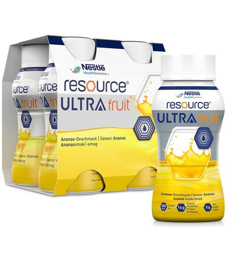 Nahrungsergänzungsmittel sind kein Ersatz für eine ausgewogene und abwechslungsreiche Ernährung und eine gesunde Lebensweise.resource® ULTRA fruit Ananas Hochkalorische, fettfreie Trinknahrung Aufbaukost bei MangelernährungGenießen Sie den leckeren Geschmack von resource® ULTRA fruit Ananas – die fruchtig-klare, fettfreie sowie hochkalorische Trinknahrung zum Diätmanagement bei bestehender Mangelernährung oder bei Risiko für eine Mangelernährung, insbesondere bei Fettverwertungsstörung oder Malassimilation. Eine Flasche (200 ml) dieser medizinischen Trinknahrung liefert 300 kcal, 14 g Eiweiß und enthält wichtige Vitamine und Mineralstoffe. resource® ULTRA fruit Ananas eignet sich besonders gut für Patient:innen mit einem erhöhten Bedarf an Energie und Nährstoffen, beispielsweise bei krankheits- oder altersbedingter Mangelernährung, in Verbindung mit Fettstoffwechselstörungen oder Malassimilation oder bei Milchaversion aufgrund der nicht-milchigen Formulierung (enthält Molkenprotein). Der erfrischende Geschmack erleichtert es, den Körper ausreichend und ausgewogen zu versorgen, wenn normale Nahrung nicht mehr ausreicht. Diese Trinknahrung ist zur ergänzenden Ernährung geeignet, jedoch nicht zur ausschließlichen Ernährung und enthält keine Ballaststoffe. resource® ULTRA fruit Ananas schmeckt gekühlt am besten und kann leicht in den Alltag integriert werden. Lagern Sie das Produkt kühl und trocken, und schütteln Sie es gut vor dem Verzehr.Häufige Fragen:Wie viele Flaschen resource® ULTRA fruit sollte ich pro Tag trinken?Zur ergänzenden Ernährung sind täglich 1 – 2 Flaschen resource® ULTRA fruit zusätzlich zu Ihrer normalen Ernährung empfohlen. Achten Sie jedoch bitte darauf, die Dauer der Anwendung und Menge von resource® Trinknahrung immer mit Ihrem Arzt zu besprechen. Wie nehme ich resource® ULTRA fruit zu mir?Für den besten Genuss empfehlen wir, resource® ULTRA fruit gekühlt zu trinken. Bitte schütteln Sie die Flasche vor dem Trinken gut durch. Die geöffnete Flasche wiederverschließen, im Kühlschrank aufbewahren und innerhalb von 24 Stunden verzehren.Für wen ist resource® ULTRA fruit geeignet?resource® ULTRA fruit ist geeignet ab 10 Jahren für Personen mit Mangelernährung, ungewolltem Gewichtsverlust und/oder erhöhtem Energiebedarf, wie etwa bei chronischen/konsumierenden Erkrankungen, nach Operationen oder altersbedingten Esstörungen. Des weiteren bei Fettverwertungsstörungen, Malassimilationssyndrom, Dialysepatienten und Patient:innen, die eine klare, flüssige Ernährung benötigen (prä- oder postoperativ).Kann ich resource® Trinknahrungen mit anderen Getränken oder Lebensmitteln mischen?Ja, Sie können resource® ULTRA fruit ganz nach Ihrem Geschmack mit anderen Getränken/Speisen mischen oder auch in Rezepten verarbeiten. Eine besonders empfehlenswerte Option ist das Mischen als Schorle mit Sprudelwasser.Kann ich resource® Trinknahrungen erhitzen?resource® ULTRA fruit kann bedenkenlos bis maximal 40 °C erwärmt werden. Kann resource® ULTRA... ...