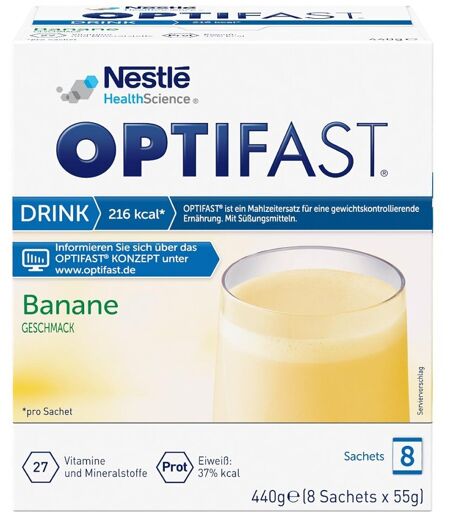Anwendungsgebiet von Optifast Drink Banane PulverOptifast Drink Banane Pulver ist ein Mahlzeitenersatz für eine gewichtskontrollierende Ernährung oder Teil einer Tagesration für gewichtskontrollierende Ernährung. So lecker kann Abnehmen sein: Der Optifast Drink Banane Pulver schmeckt angenehm nach Banane und ist so nahrhaft wie eine Mahlzeit bei nur rund 216 Kalorien.