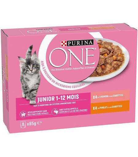 Wenn ein kleiner Stubentiger Teil deiner Familie ist, solltest du ihn mit einem maßgeschneiderten Futter verwöhnen, um ihn beim Wachsen und Gedeihen zu unterstützen. PURINA ONE Junior 8 x 85 g ist ein Nassfutter, das alle wichtigen Nährstoffe enthält, damit deine kleine Samtpfote zu einer stattlichen Katze heranwächst. PURINA ONE Junior 8 x 85 g enthält gleich 2 delikate Sorten aus zarten Häppchen mit Huhn oder Lachs in köstlicher Soße, verfeinert mit vitalstoffreichen Karotten. Die Kittenmahlzeit enthält dabei essentielle Omega-Fettsäuren, die für glänzendes Fell, normale Haut und die Entwicklung der natürlichen Gehirnfunktion wichtig sind. Zur Unterstützung einer optimalen Verdauung deines Kitten sind zudem reichlich Ballaststoffe enthalten. PURINA ONE Junior 8 x 85 g im Überblick: Köstliches Nassfutter für Kitten .product-description__grid-wrapper { width:100%; display:inline-grid; grid-template-columns: 1fr 1fr; grid-gap: 20px; } @media (max-width: 500px) { .product-description__grid-wrapper { grid-template-columns: 1fr; } } Für den besten Start ins Leben PURINA ONE Junior ist ein ausgewogenes Nassfutter und wurde in seiner Rezeptur speziell auf die Bedürfnisse von Jungkatzen von 1 - 12 Monaten zugeschnitten. Essentielle Nährstoffe Das Kittenfutter liefert deinem Kätzchen DHA, eine essentielle Omega-3-Fettsäure, die auch in der Katzen-Muttermilch vorkommt und eine normale Entwicklung der Gehirn- und Sehfunktion unterstützt. Köstliche Textur Die saftigen Stückchen mit hochwertigem Lachs in delikater Sauce liefern deinem Kitten ein hervorragendes Geschmackserlebnis sowie hochwertiges Protein, was einen idealen Muskelaufbau fördert. Optimale Entwicklung Die maßgeschneiderte Rezeptur unterstützt mit einem speziellen Nährstoffprofil die normale Entwicklung aller wichtigen Körper- und Vitalfunktionen sowie ein harmonisches Wachstum. Unterstützung der Verdauung: enthält wertvolle Ballaststoffe Antioxidantien sowie Vitamin E: kann dabei helfen, ein normales Immunsystem zu fördern Omega-3- Omega-6-Fettsäuren: können Haut und Fell unterstützen Hoher Feuchtigkeitsgehalt: trägt zu ausreichende Aufnahme von Flüssigkeit bei Mit Taurin: lebensnotwendige Aminosäure für normale Sehkraft Naturbelassen: ohne Zusatz von künstlichen Farb- Konservierungsstoffen Mit Fachkompetenz entwickelt: von Tierärzten und Ernährungsexperten ...